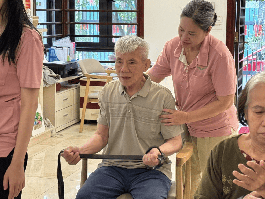 Sau giờ phục hồi chức năng, ông bà tiếp tục với các bài tập vận động nhẹ như sử dụng dây kháng lực, giãn cơ và tập thở. Mỗi động tác đều được hướng dẫn cẩn thận, phù hợp với thể trạng từng người, giúp cơ thể dẻo dai hơn và tinh thần thêm thư thái.
